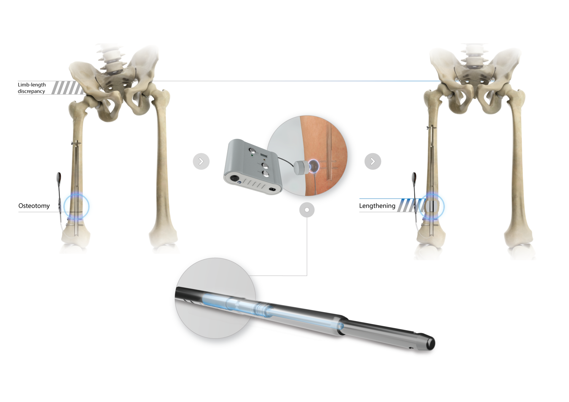 The Precice method, developed in the United States, is also an internal lengthening system but functions differently. It uses a magnetically driven nail that responds to an external hand-held device called an ERC (External Remote Controller). Patients place the ERC on the limb several times per day, which activates the internal magnet and causes the nail to expand.